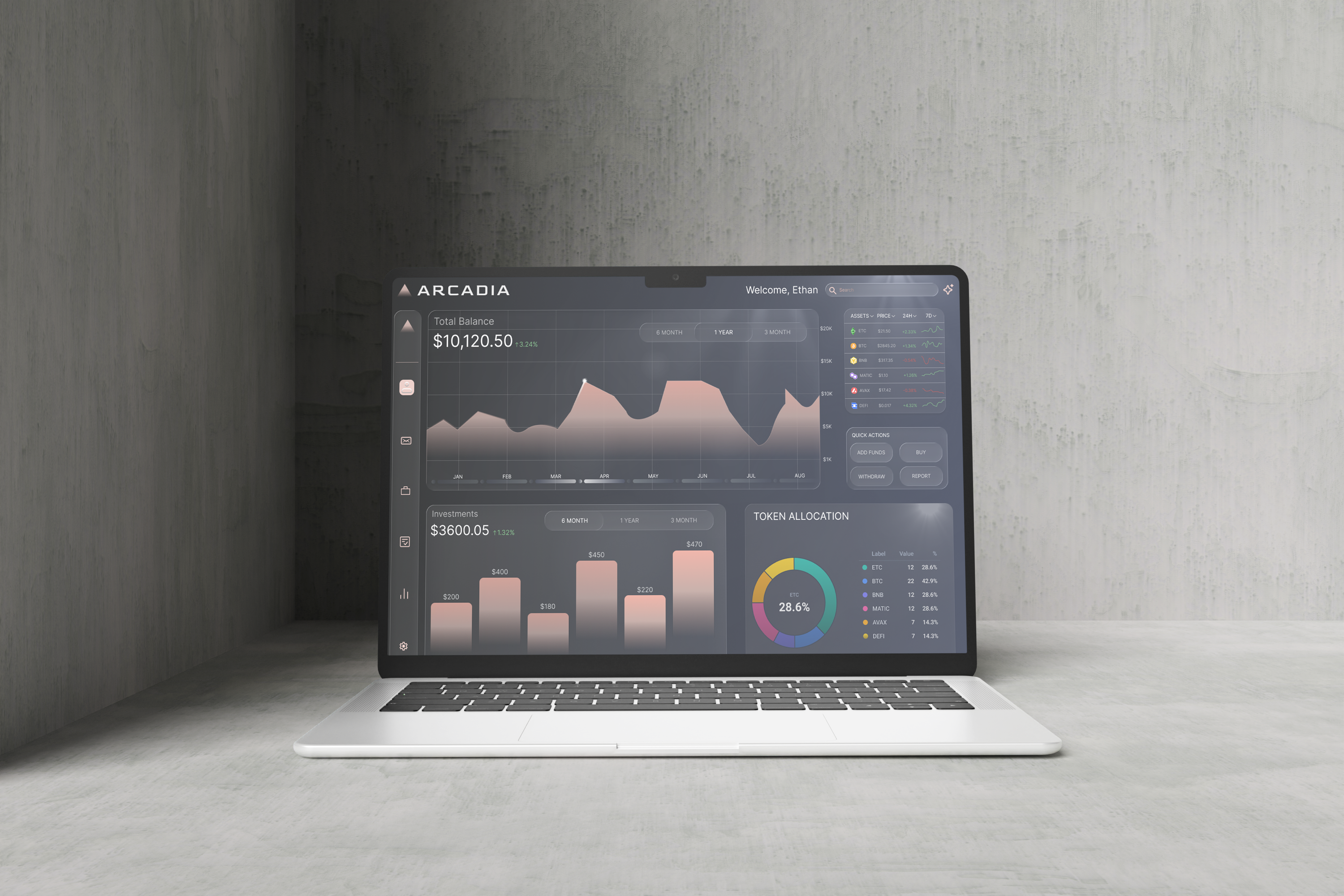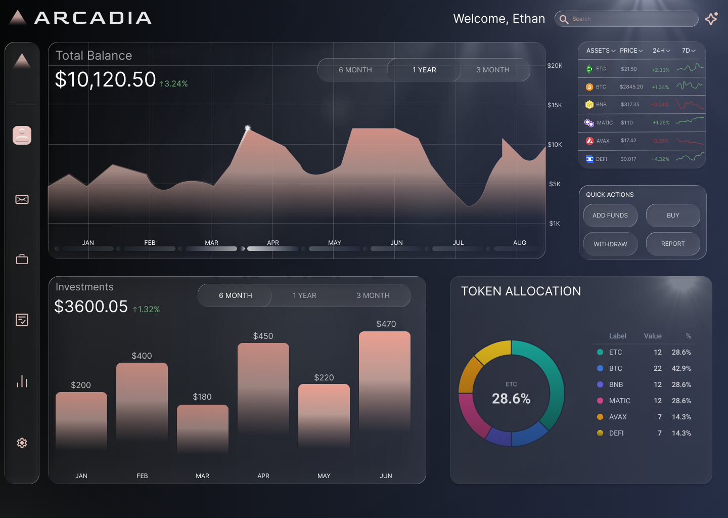 Arcadia is a concept investment platform that unifies finance management—stocks, crypto, and savings—into one modern experience.