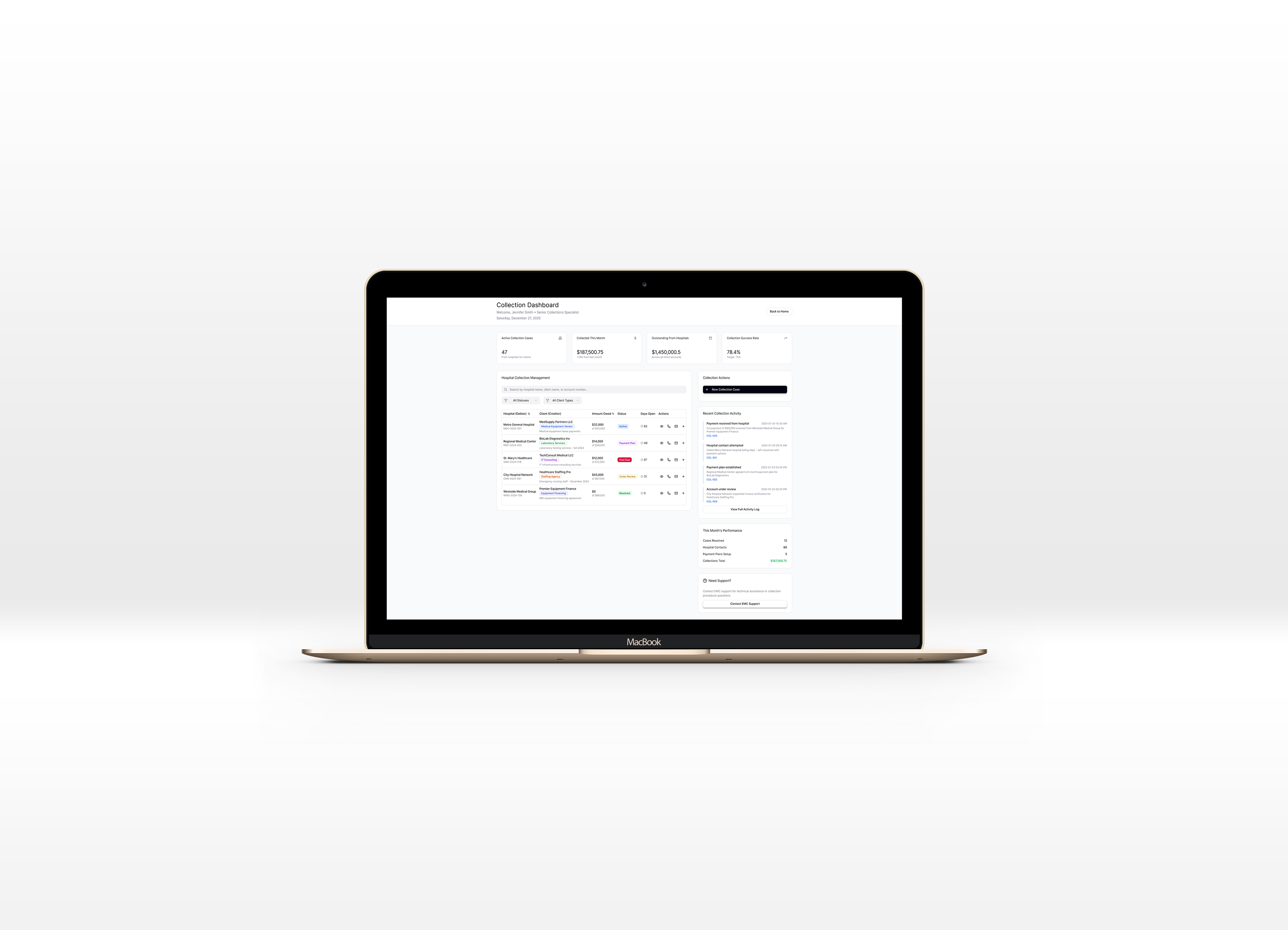 Collectors land on a centralized dashboard that surfaces active cases, outstanding balances, and performance metrics at a glance.