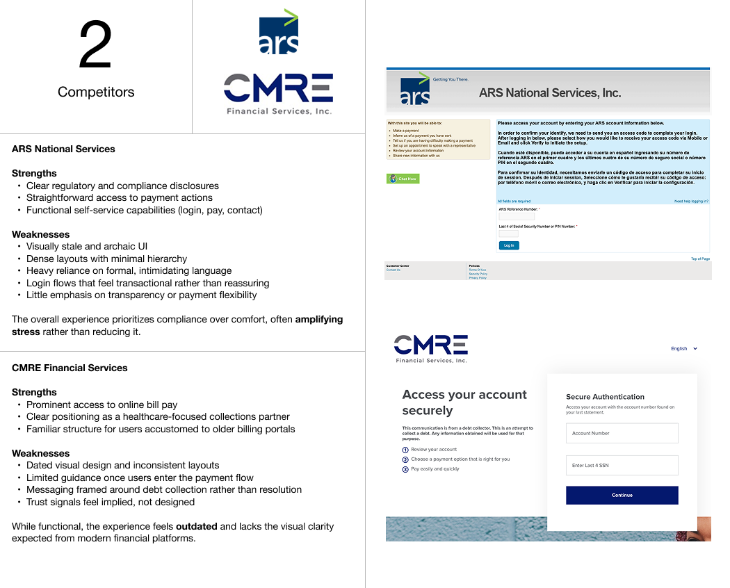 To understand how medical debt collection platforms currently serve patients and account holders, I evaluated existing healthcare-focused collection experiences and identified where trust, clarity, and usability break down.