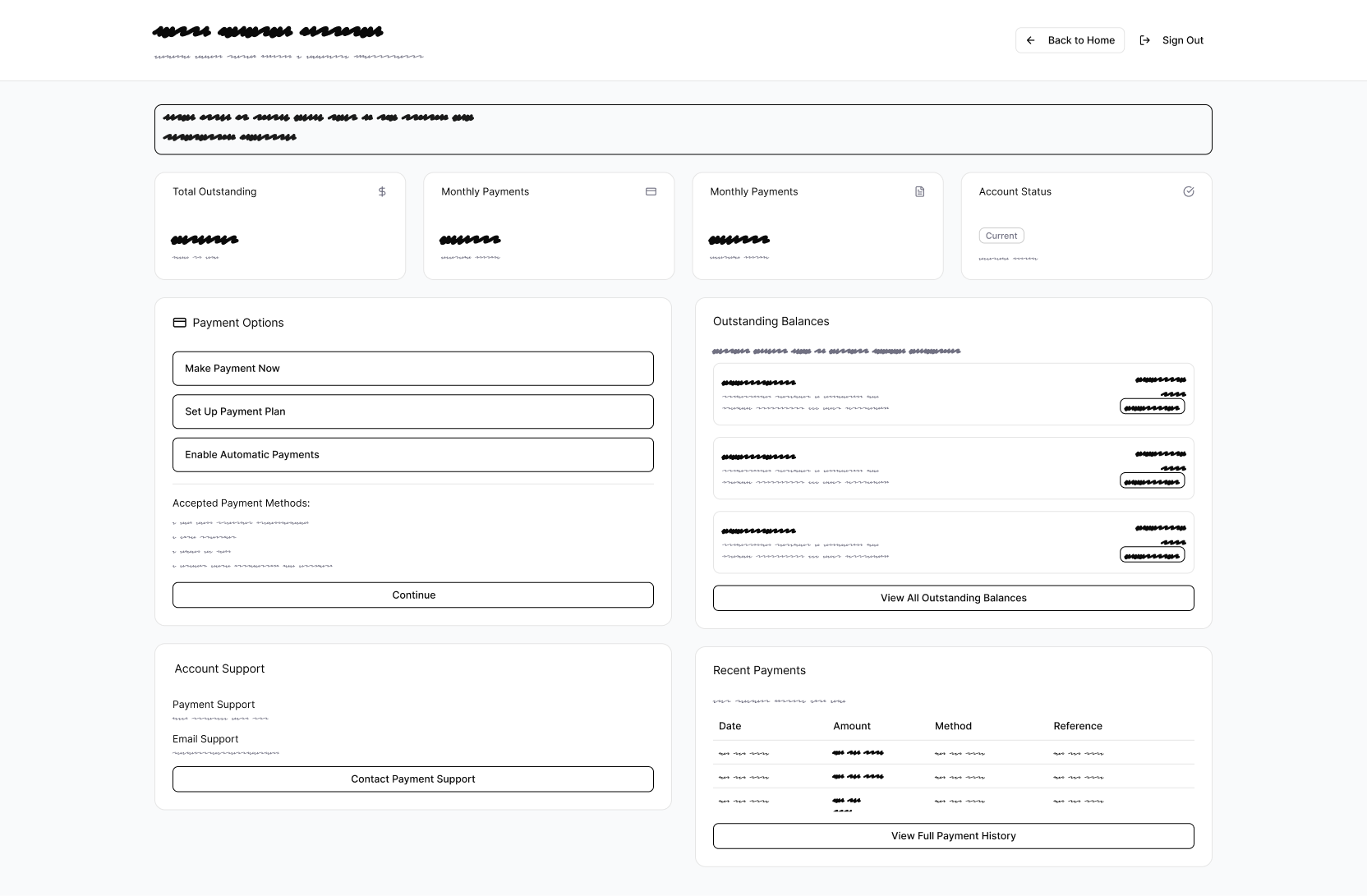 High-level visibility into balances, account status, and payment history, with obvious paths to action.