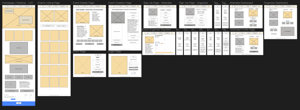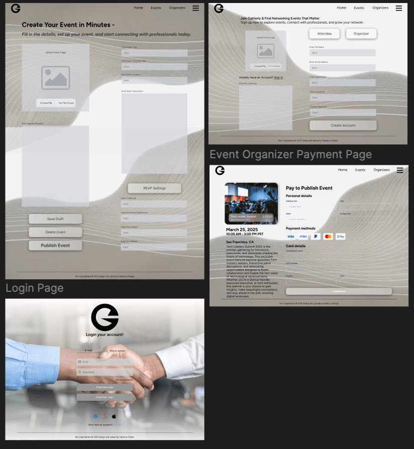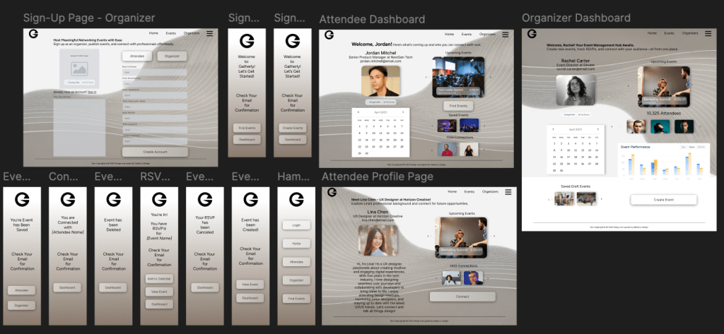 I mapped Gatherly’s information architecture in FigJam to define clear user journeys for both attendees and organizers. By separating the two paths while keeping them visually connected, the flow ensures: