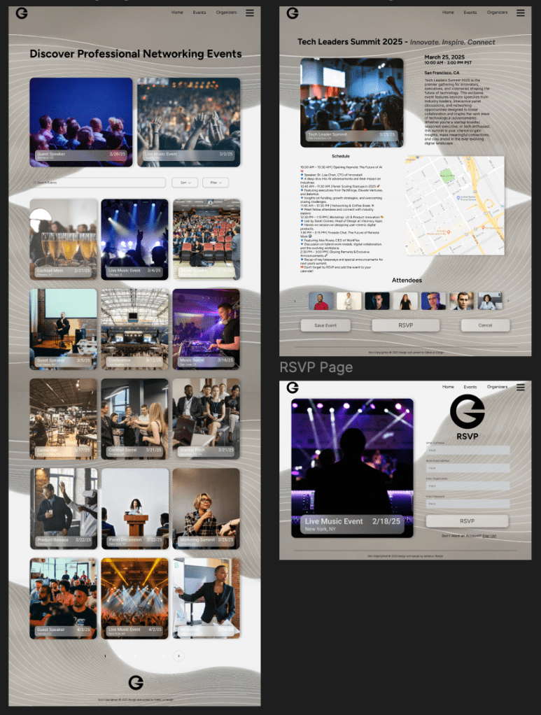 - Event details page displaying speaker info, agenda, and RSVP options.