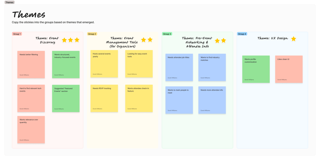 Moderated tests with 4 professionals (software engineer, marketing manager, entrepreneur, HR director) using a mid-fidelity prototype. Tasks covered event discovery, RSVP, pre-event prep, and organizer workflows. Findings were synthesized via affinity mapping.