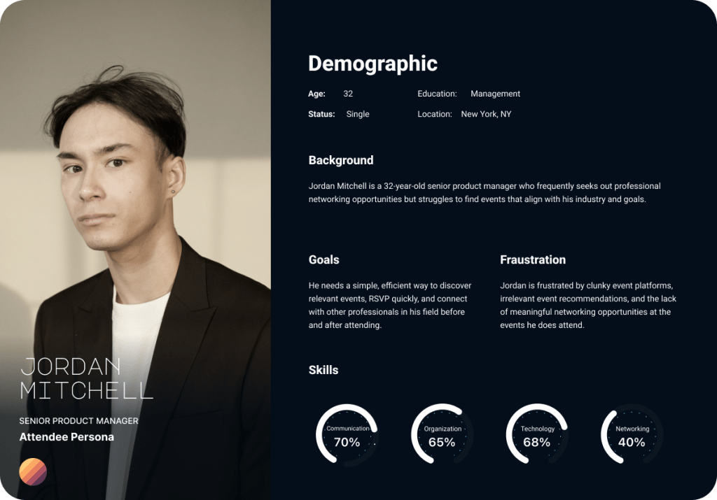 - Age: 32 | Job: Senior Product Manager | Pain Points: Hard to find relevant networking events.